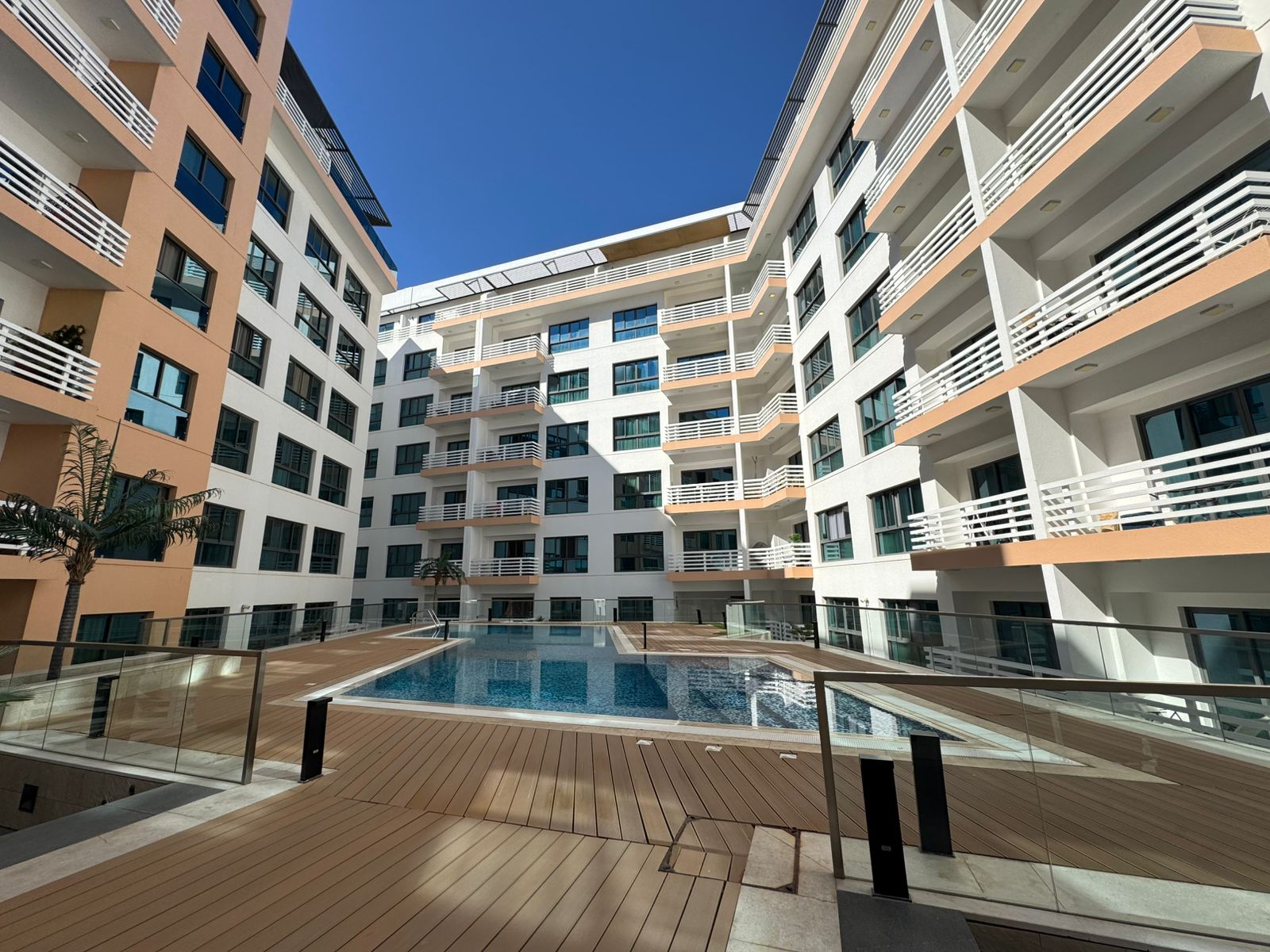 - Spacious living area with balcony overlooking the pool view