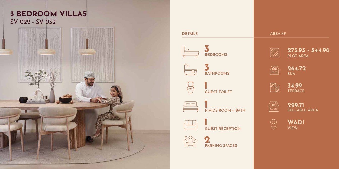 An elegant multi-level villa designed for refined coastal living, combining generous indoor spaces, private outdoor areas, and breathtaking wadi views within the exclusive Muscat Bay community.